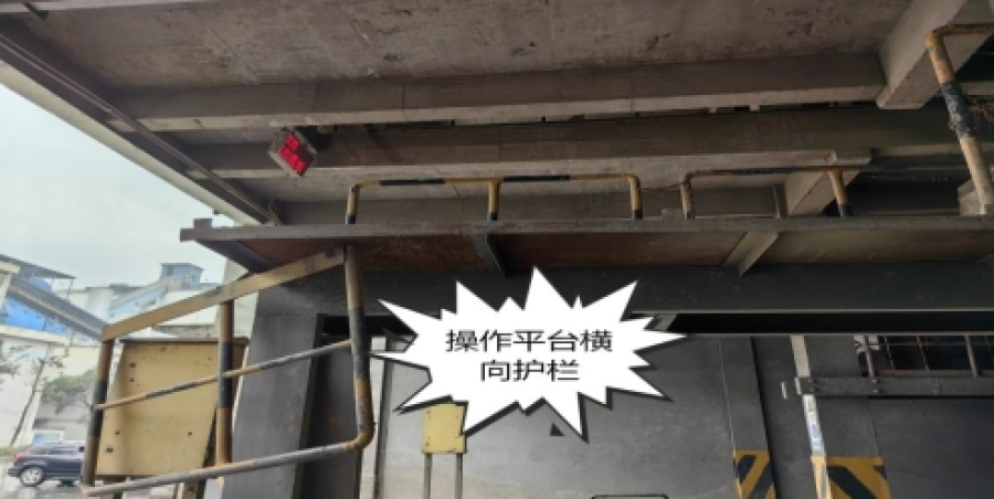 事故现场位于特水有限公司水泥袋装车间3号车道出口处,操作平台高度距离地面2.65m,宽1.34m,防护栏杆高度1.13m,被车辆尾部擦挂位置为防护栏杆中部,距离地面高度为3.15m,栏杆和平台是电焊焊接而成,事故中被挂掉的栏杆见下图。