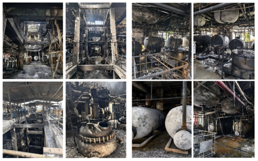 事故造成一车间B区大面积失火,过火面积约200平方米,大量生产装置及电力线缆不同程度受损和烧毁。图1