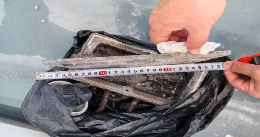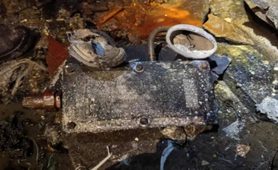 从火灾视频中横直方向铁管上的火光判断出第一起火点在4号摄像头所在位置的墙壁与两根横直铁管之间偏下区域,该范围的电气设备是应急照明灯具,我们在灯具安装位置下面的地面上发现了此已严重破坏的应急照明灯具,且拆开灯具后发现有明显的内部燃烧痕迹。见图6.7.8.9。