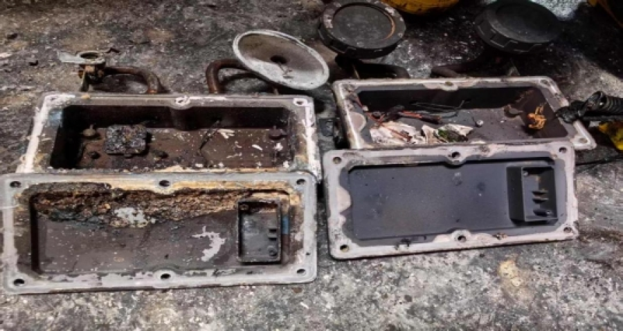 图8左为烧毁的应急照明灯具,有明显内部烧痕。右为对比灯具,有明显的高温熔融痕迹