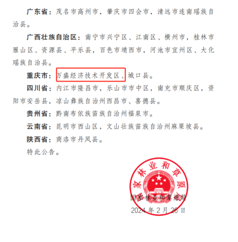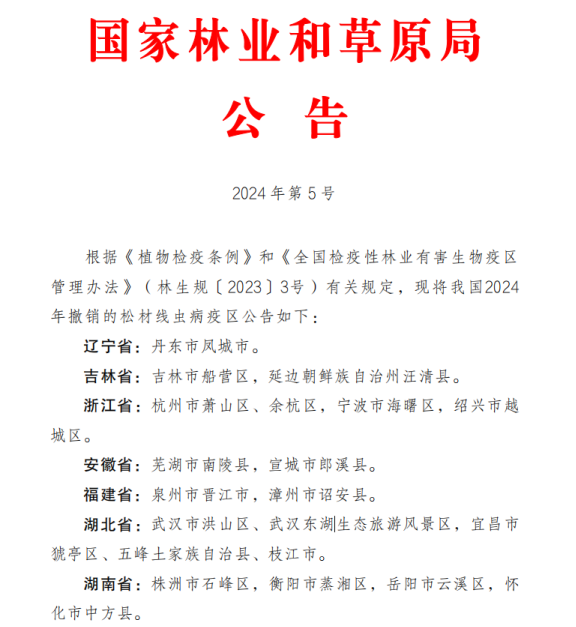 【要情通报】△近日,国家林业和草原局发布2024年撤销松材线虫病疫区公告,万盛经开区位列其中,松材线虫病疫区实现“清零”。