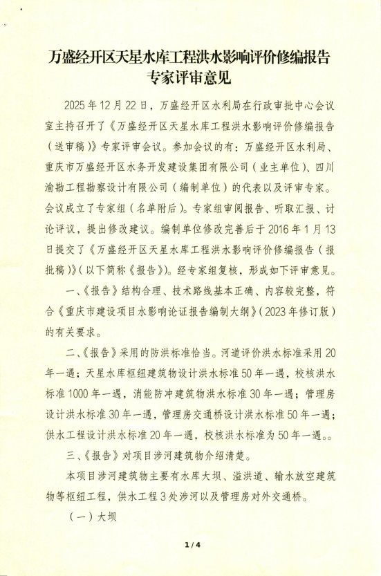 2.《万盛经开区天星水库工程洪水影响评价修编报告》专家评审意见。