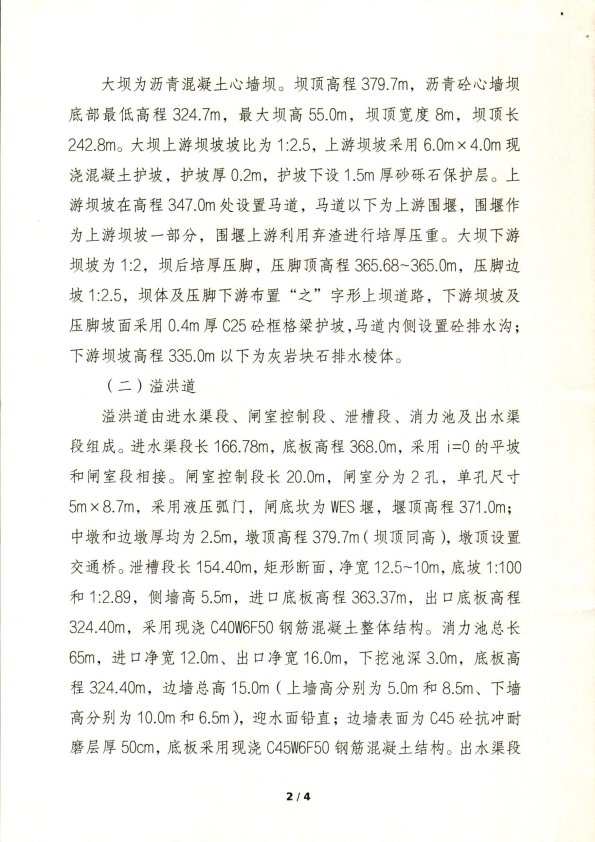 大坝为沥青混凝土心墙坝。坝顶高程379.7m,沥青砼心墙坝底部最低高程324.7m,最大坝高55.0m,坝顶宽度8m,坝顶长242.8m。大坝上游坝坡坡比为1:2.5,上游坝坡采用6.0m×4.0m现浇混凝土护坡,护坡厚0.2m,护坡下设1.5m厚砂砾石保护层。上游坝坡在高程347.0m处设置马道,马道以下为上游围堰,围堰作为上游坝坡一部分,围堰上游利用弃渣进行培厚压重。大坝下游坝坡为1:2,坝后培厚压脚,压脚顶高程365.68~365.0m,压脚边坡1:2.5,坝体及压脚下游布置“之”字形上坝道路,下游坝坡及压脚坡面采用0.4m厚C25砼框格梁护坡,马道内侧设置砼排水沟;下游坝坡高程335.0m以下为灰岩块石排水棱体。