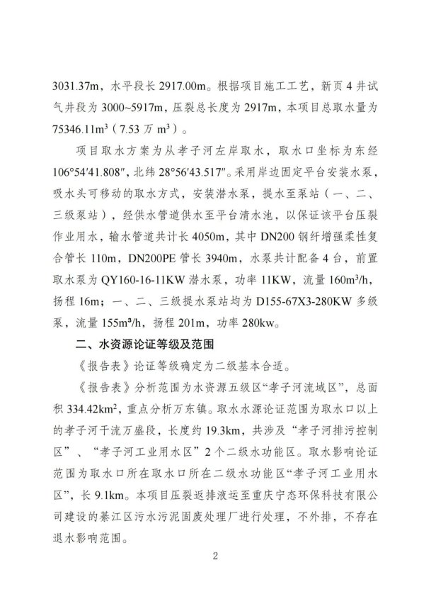 中石化新页4井钻探工程(侧钻水平井完井试气工程)位于万盛经开区南桐镇石桥村,项目取水用途为页岩气勘探井压裂作业用水,不含开采,属工业用水。取水方式提水(水泵:型号QY160-16-11KW,流量为Q=160m3/h,泵设计扬程H=16m,取水头部高程为298m,功率11KW),提水后经三级泵站加压,加压泵均为D155-67X3-280KW多级泵,输水管道共计长4050m,其中DN200钢纤增强柔性复合管长110m,DN200PE管长3940m,配套2000m3清水池。水资源论证报告表确定的分析范围和论证等级基本合适。