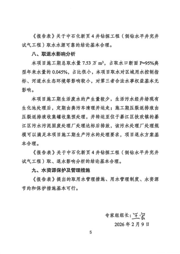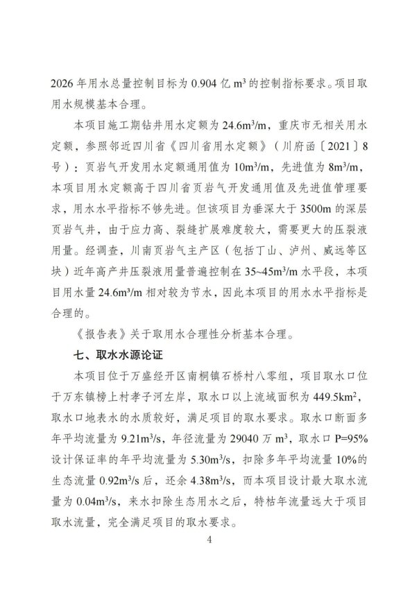 根据《中石化新页4井钻探工程(侧钻水平井完井试气工程)水资源论证报告表》及其专家组评审意见(见附件),取水地点位于重庆市万盛经开区万东镇榜上村孝子河左岸(坐标:东经106°54′41.808″,北纬28°56′43.517″),批准取水量为7.53万m3,最大取水流量为160m3/h(0.05m3/s)。
