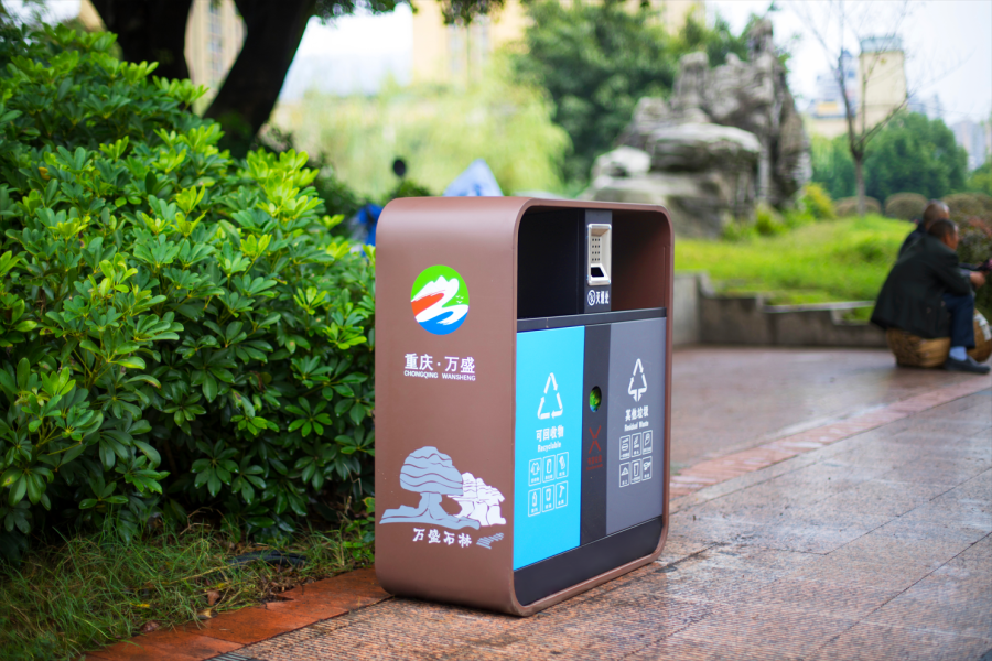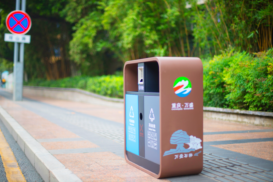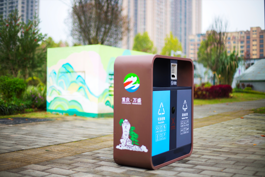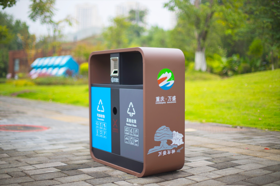 新果皮箱采用“可回收物”和“其他垃圾”二分设计,箱体融入黑山谷、石林等万盛地方特色图案,兼具实用功能与文化宣传作用,既好看,又实用。