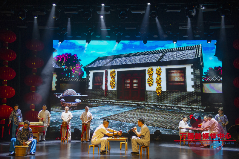 2006年入选中国国家级非物质文化遗产的“金桥吹打”,其演奏形式及所用乐器,源于宋元,盛于明清,距今已有700多年历史。此次线上春晚,《龙门阵·幸福生活》以金桥吹打传统曲牌为载体,剧情以酒馆“摆龙门阵”为线索,演员们通过合奏吹打和情景剧表演的方式,表达了万盛儿女对美好幸福生活的向往。