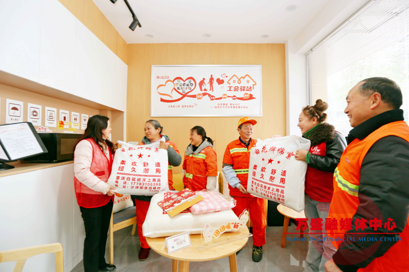 1月28日,东林街道观井湾社区工会驿站,区总工会志愿者为环卫工人、外卖骑手、快递小哥等户外劳动者送上棉絮、棉衣等过冬保暖用品。