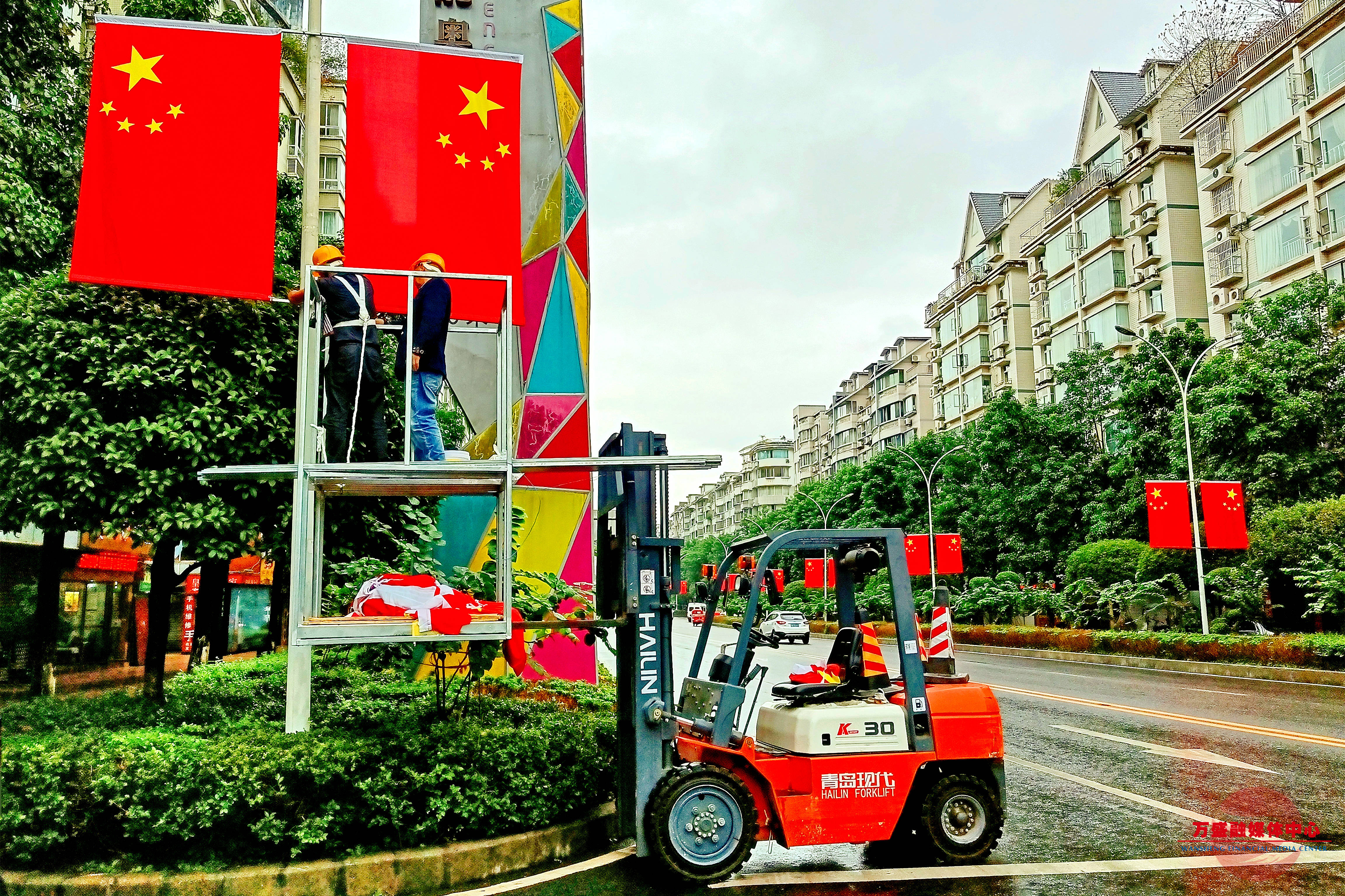 9月21日,工人在万盛大道悬挂鲜艳的五星红旗,营造庆祝中华人民共和国成立73周年的浓厚氛围。