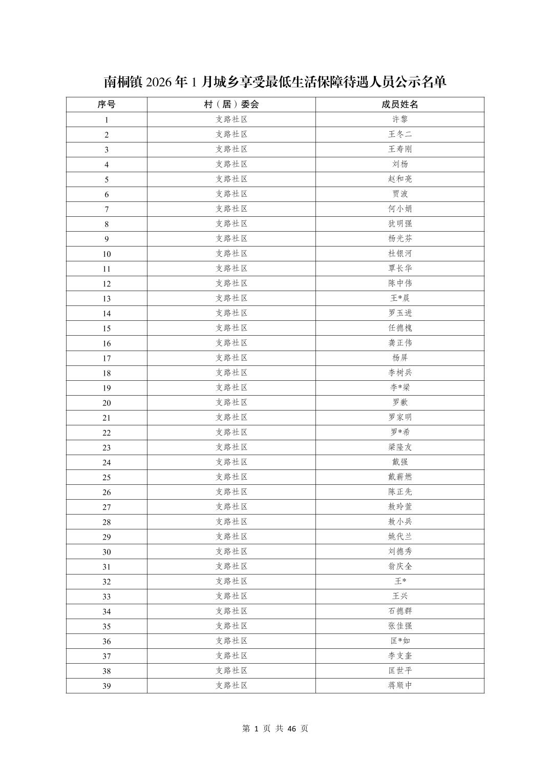 南桐镇2026年1月城乡享受最低生活保障待遇人员公示名单