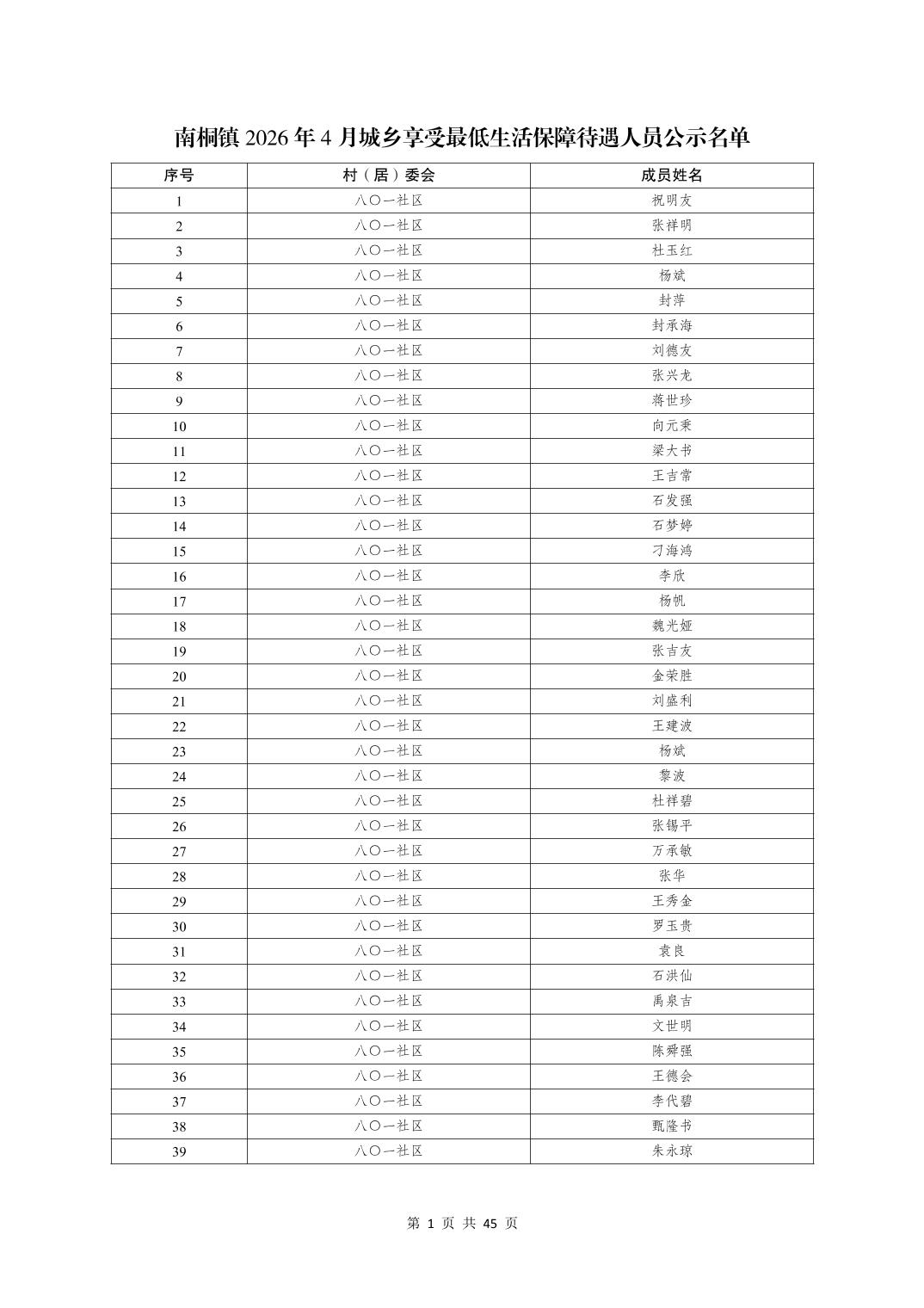 南桐镇2026年4月城乡享受最低生活保障待遇人员公示名单
