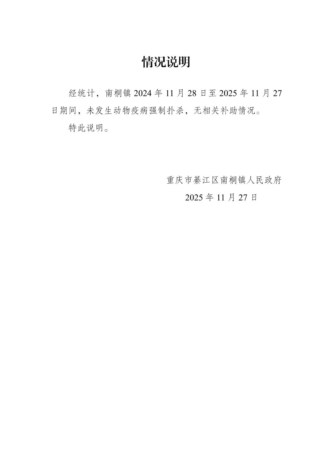 南桐镇关于2024年11月28日至2025年11月27日动物疫病强制扑杀补助的情况说明