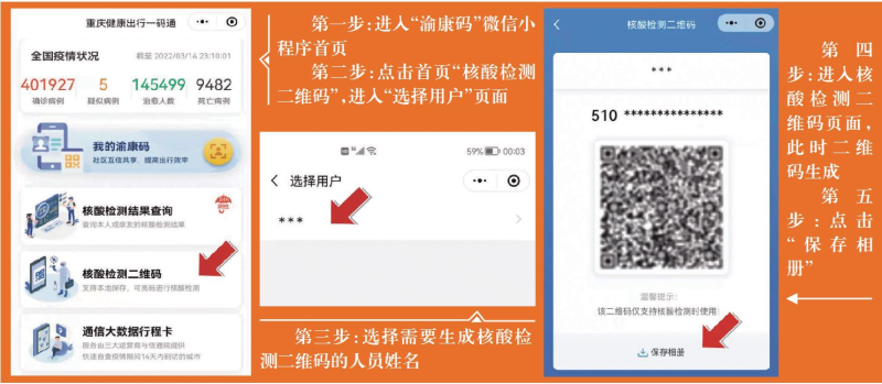 如何获取核酸检测二维码?市民可在“渝康码”微信小程序首页点击“核酸检测二维码”,然后选择需要生成核酸检测二维码的人员姓名,二维码便就生成了。随后,点击“保存相册”。通过这种方式,市民还可为亲友生成核酸检测二维码。