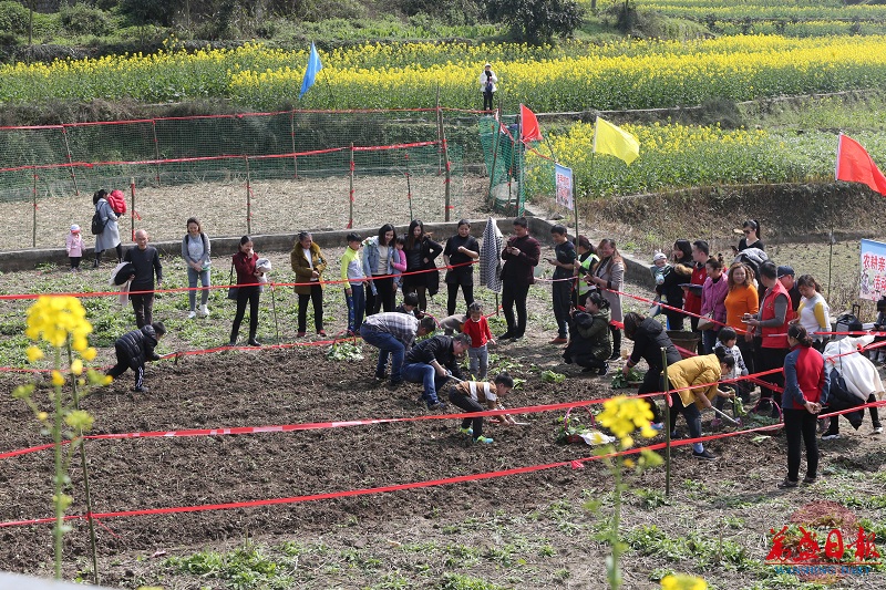 眼下正是春耕春播的好时节,在“农耕体验”活动现场,气氛十分热烈。游客两人为一组,有的亲子上阵,有的自由组合,大家撩起衣袖、卷起裤腿、手提竹篮,下地大展身手,将菜苗一棵棵栽进土里,现场观众看得跃跃欲试。
