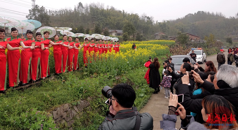 在另一块花田中,几位身穿红色服装的游客欢笑着,尽情享受着无限春光。来自重庆市沙坪坝区的游客梁邦信说:“我昨天和朋友一起游玩了梦幻奥陶纪,准备今天下午回家。恰好在报纸上看到今天有油菜花节,大家就商量着再住一晚,今天先来新建村瞧瞧,没想到油菜花那么好看,油菜花节那么好耍,的确不虚此行。”