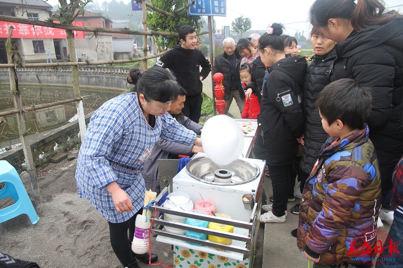 在杨本松的鸡蛋摊对面,来自南川区南平镇的刘安全售卖着自制的麻糖。口感香甜的麻糖俘获了不少游客的味蕾,一个半小时内,刘安全就赚了近200块钱,这令他十分开心。“我听说丛林要搞油菜花节,就专门过来卖我们自己做的麻糖。今天游客多,生意很不错。”刘安全说。