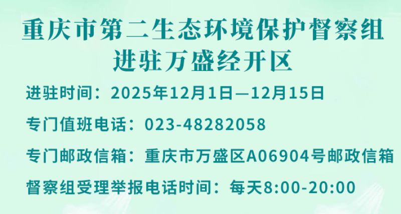 重庆市第二生态环境保护督察组进驻时间为2025年12月1日—12月15日,进驻期间设立专门值班电话:023-48282058,专门邮政信箱:重庆市万盛区A06904号邮政信箱。督察组受理举报投诉电话时间为每天8:00—20:00。根据督察安排,督察组主要受理万盛经开区生态环境保护方面的来信来电信访举报,其他不属受理范围的信访举报问题,将按规定交由万盛经开区按程序办理。