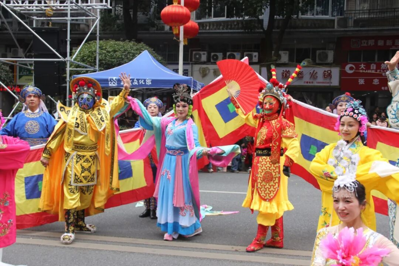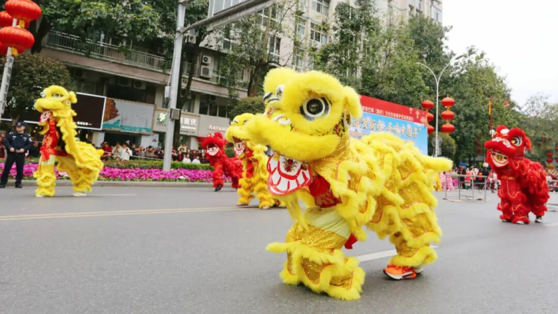 万盛街道用喜庆热闹的舞狮、川剧变脸、天女散花、跑旱船