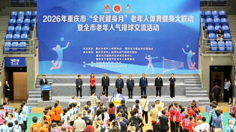 4月27日,2026年重庆市“全民健身月”老年人体育健身大联动暨老年人气排球交流活动开幕式在区文体中心体育馆举行。市老体协主席周克勤宣布开幕,党工委书记戴明致欢迎辞,市老体协副主席陈大奎致辞,区领导涂山全、罗玉平,区老体协名誉主席岳建忠等出席活动。