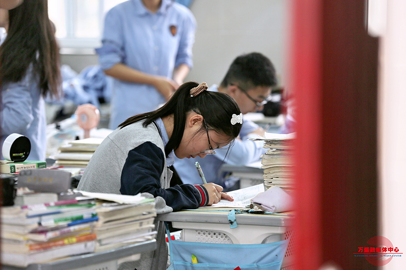 明亮的教室里随处可见励志标语,黑板上罗列着满满“干货”,厚厚的书本堆成了一座座“小山”,倒计时板上的数字让气氛紧张不已。同学们迅速进入状态,有的忙着背诵,有的养精蓄锐,有的专注“刷题”……一张张青涩的脸庞上,写满了坚定。