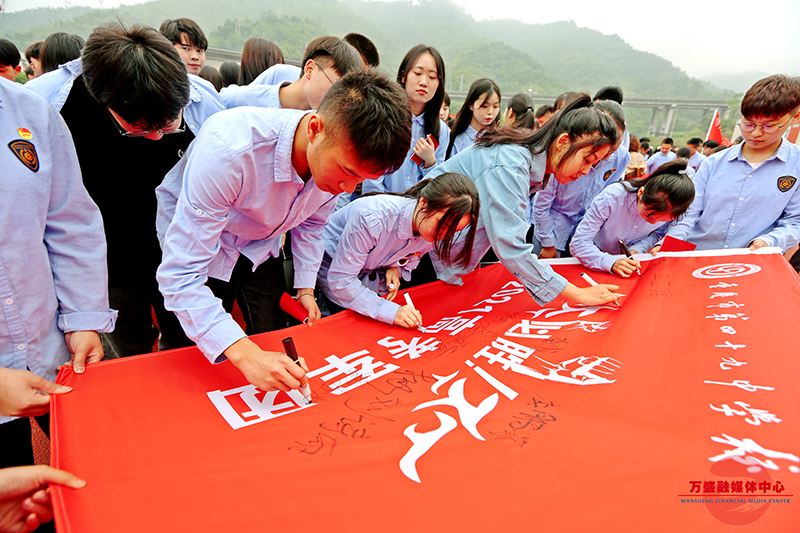 高考出征仪式上,学生们在战旗上写下自己的名字。王泸州 摄