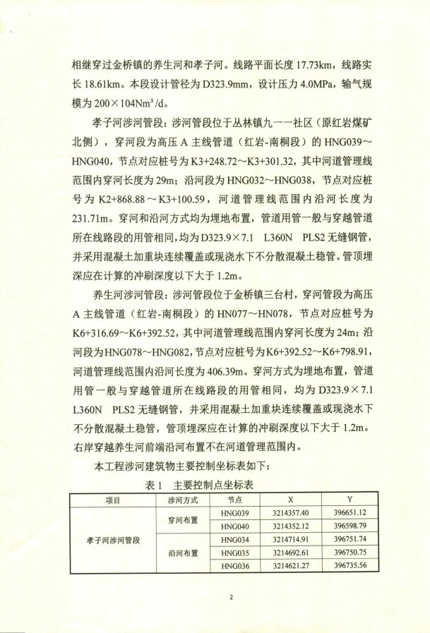 孝子河涉河管段:涉河管段位于丛林镇九一一社区(原红岩煤矿北侧),穿河段为高压A主线管道(红岩-南桐段)的HNG039~HNG040,节点对应桩号为K3+248.72~K3+301.32,其中河道管理线范围内穿河长度为29m;沿河段为HNG032~HNG038,节点对应桩号为K2+868.88~K3+100.59,河道管理线范围内沿河长度为231.71m。穿河和沿河方式均为埋地布置,管道用管一般与穿越管道所在线路段的用管相同,均为D323.9×7.1mmL360NPLS2无缝钢管,并采用混凝土加重块连续覆盖或现浇水下不分散混凝土稳管。管顶埋深应在计算的冲刷深度以下大于1.2m。