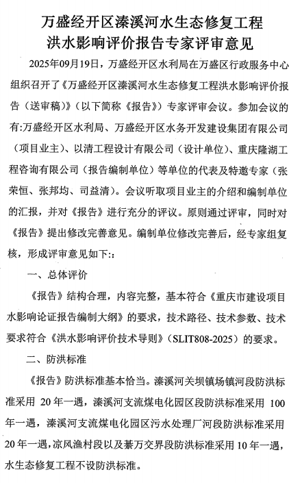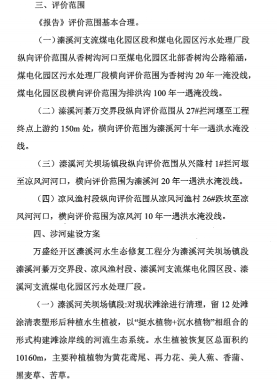 一、项目涉河段位于万盛经开区关坝镇。同意溱溪河关坝镇场镇河段防洪标准采用20年一遇,溱溪河支流煤电化园区段防洪标准采用100年一遇,溱溪河支流煤电化园区污水处理厂河段防洪标准采用20年一遇,凉风渔村段以及綦万交界段防洪标准采用10年一遇,水生态修复工程不设防洪标准。