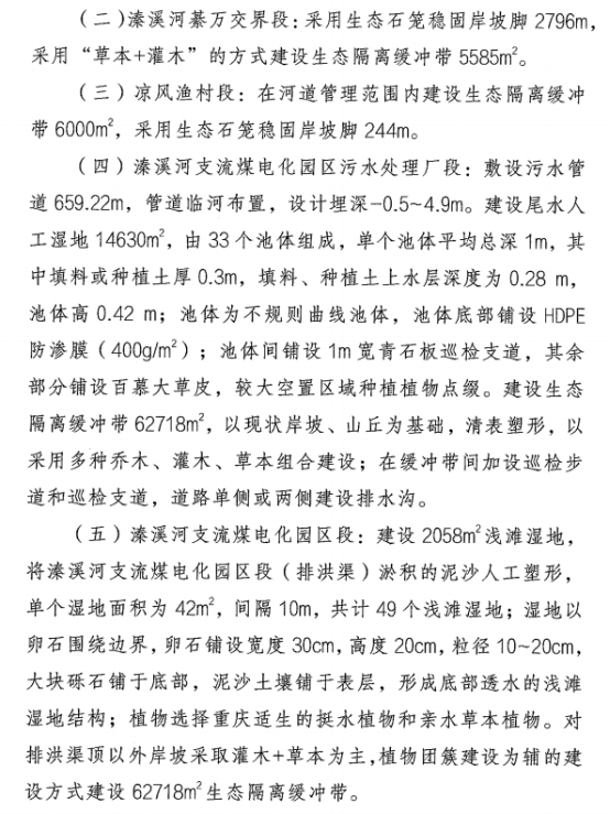 溱溪河支流煤电化园区污水处理厂段:敷设污水管道659.22m,管道临河布置,设计埋深-0.5-4.9m。建设尾水人工湿地14630m2,由33个池体组成,单个池体平均总深1m,其中填料或种植土厚0.3m,填料、种植土上水层深度为0.28m,池体高0.42m;池体为不规则曲线池体,池体底部铺设HDPE防渗膜(400g/m2);池体间铺设1m宽青石板巡检支道,其余部分铺设百慕大草皮,较大空置区域种植植物点缀。建设生态隔离缓冲带62718m2,以现状岸坡、山丘为基础,清表塑形,以采用多种乔木、灌木、草本组合建设;在缓冲带间加设巡检步道和巡检支道,道路单侧或两侧建设排水沟。