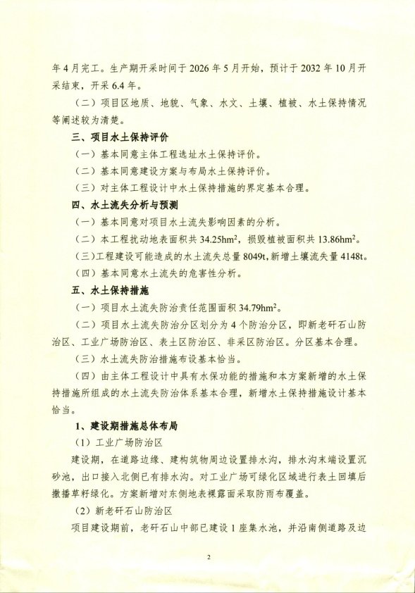 (五)同意水土流失防治目标。其中:水土流失治理度达到94%,土壤流失控制比等于1.0,渣土防护率达到88%,表土保护率87%,林草植被恢复率达到95%,林草覆盖率达到6%。