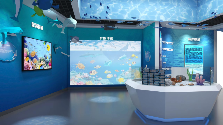 数字海洋馆占地125平方米,以海洋深度为脉络,设置“追梦幻海”“牵梦蓝海”“坠梦深海”“节水护海”四大展区,带领观众从透光层一步步深入无光层,了解海洋资源与保护知识,在视觉盛宴中传递“节水护海”理念。