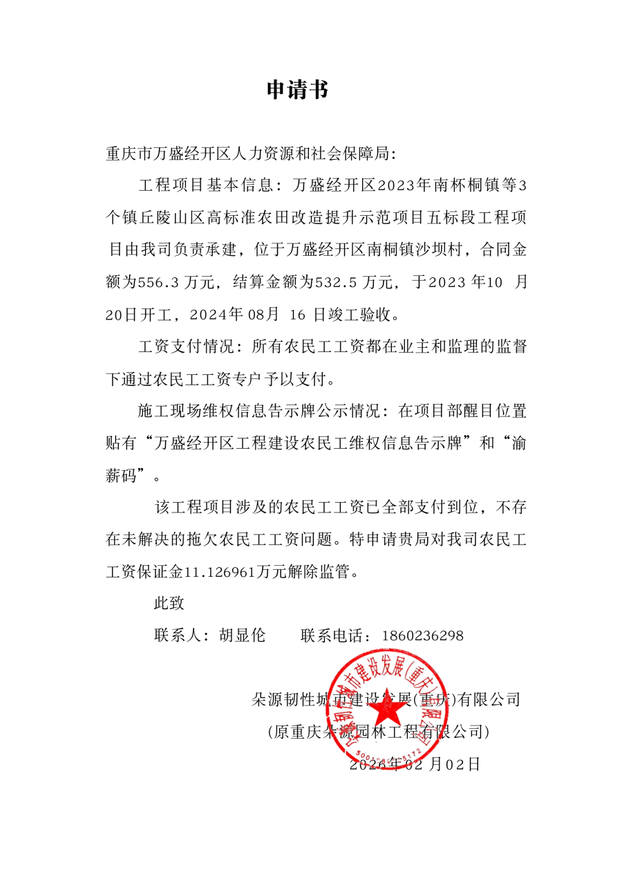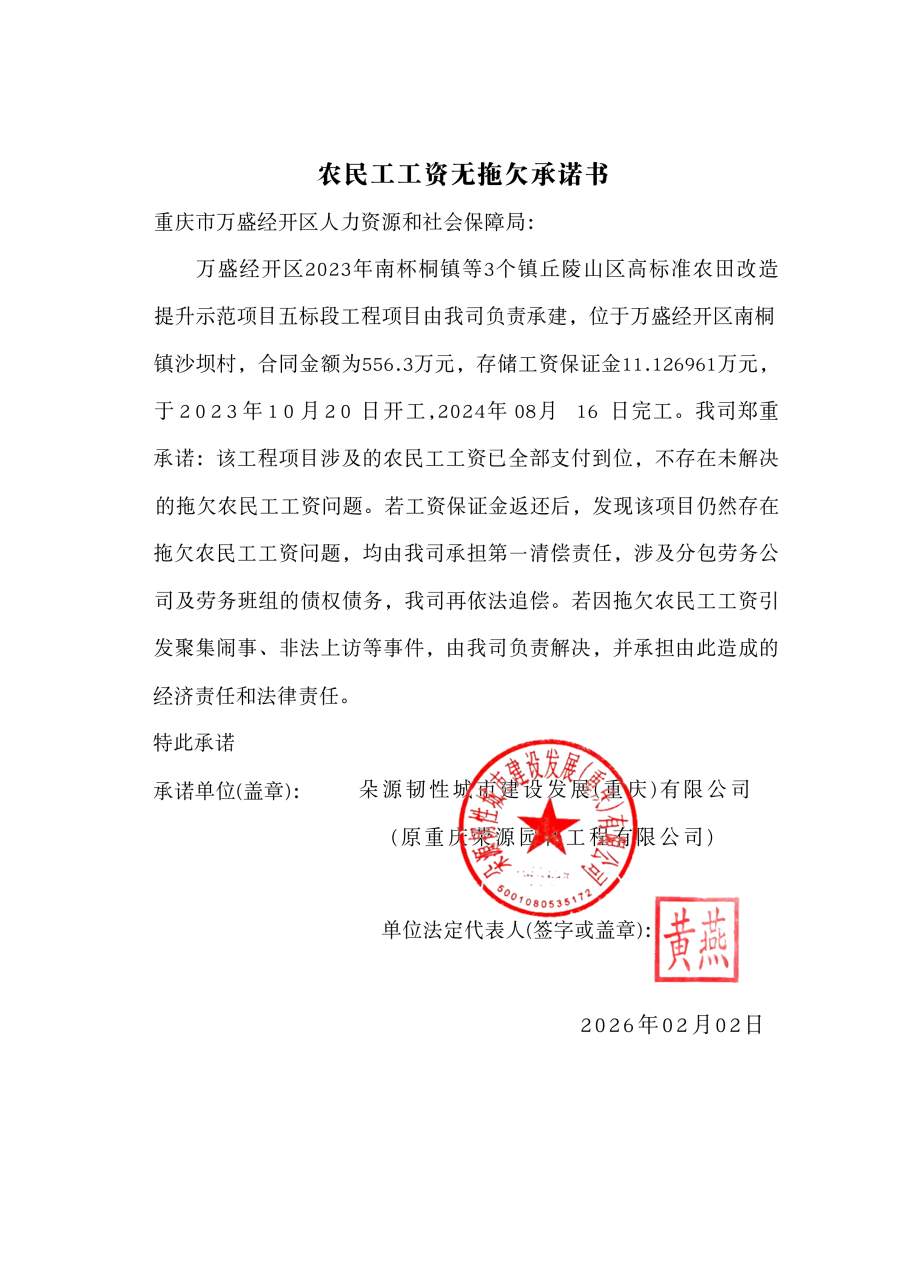 朵源韧性城市建设发展(重庆)有限公司(原重庆朵源园林工程有限公司)农民工工资无拖欠承诺书