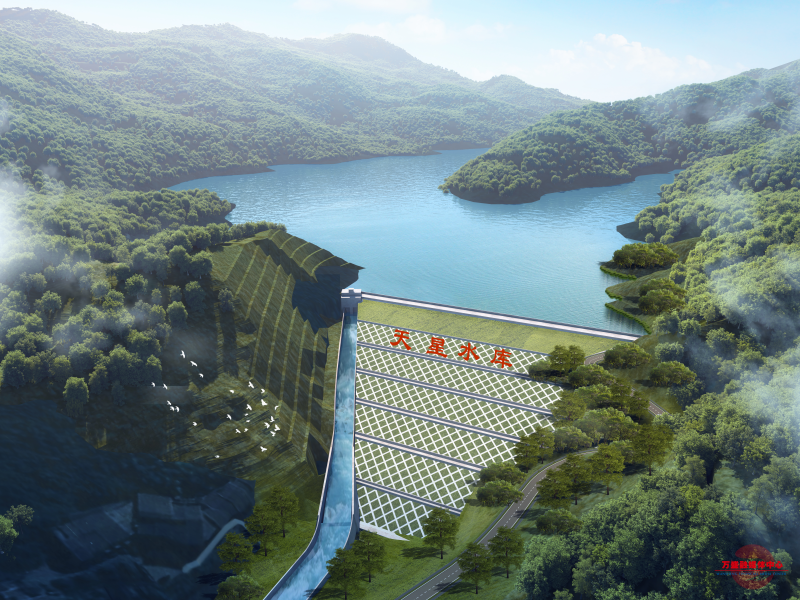 7月13日上午,驱车来到天星水库工程开工建设现场。一下车,天星水库的效果图映入眼帘,只见群山峡谷之中,一座巍巍大坝,横亘在两山之间,坝坡芳草萋萋,看上去恰似一幅山水画,让人不禁感慨:与其说这是一项水利工程,倒不如说,这是一次城市与水、发展与水、人与自然环境进行的智慧对话。