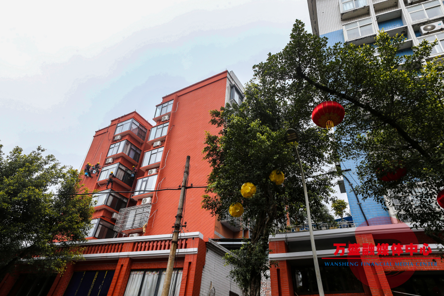 图为万盛街道新田路片区城市更新项目现场,工人正在为楼房外立面进行提档升级,一幅“旧貌换新颜”的宜居画卷正徐徐展开。