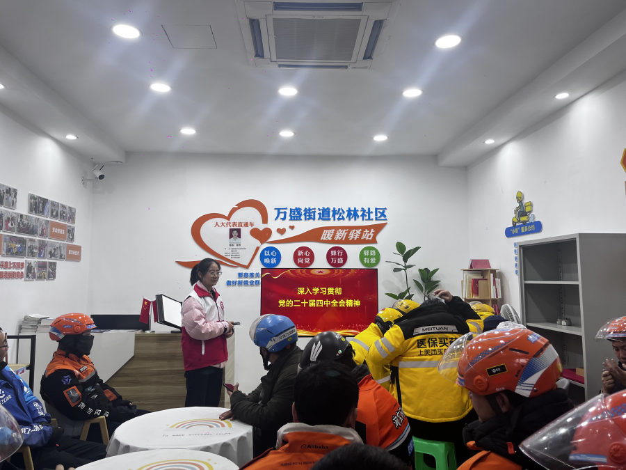 新春将至,年味渐浓。为深入学习宣传党的二十届四中全会精神,切实把党组织的关怀与温暖送到新就业群体心坎上,万盛街道松林社区工会在暖新驿站开展“关爱新群体·凝聚新力量”主题活动,让奔波在城市街巷的外卖骑手、快递员等劳动者感受到“家”的温暖。